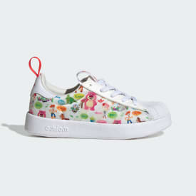 Take little ones on an adventure to infinity and beyond in these kids' adidas shoes. Inspired by Disney Pixar's "Toy Story," the graphics feature Buzz Lightyear, Woody and friends for an out-of-this-world look. A bendy and ultra-soft outsole and slip-on design with elastic laces keep kids comfortable whether they're exploring Andy's room or venturing into space. These play-ready shoes bring the classic style of the adidas Superstar shoes into a kid's universe.